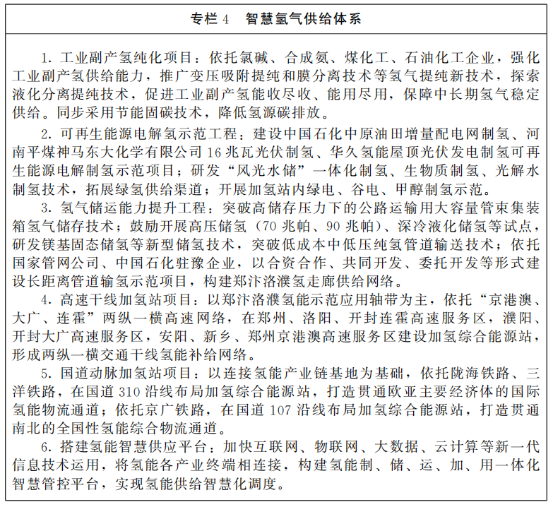(一)建设氢能示范应用轴带。以交通领域氢能示范应用为突破口,重点建设高速、国道交通干线氢走廊、郑汴洛文化旅游城际客运氢能示范项目、郑汴濮陆港联运物流集散货运氢能示范项目、郑汴洛濮绿色低碳市政交通氢能示范项目。积极探索氢能在分布式能源、储能领域的应用,推动氢能在冶金、建材、化工等工业领域融合发展。