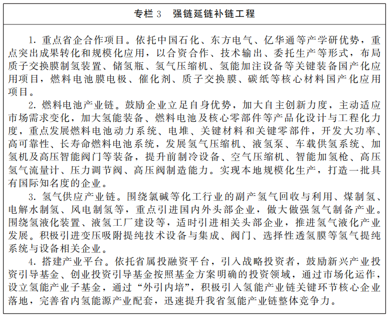 (三)拓展融资渠道。发挥国有资本撬动作用,依托省属投融资平台,引入战略投资者。鼓励新兴产业投资引导基金、创业投资引导基金,按照基金方案明确的投资领域,通过市场化运作,设立氢能产业子基金。联合专业研究机构、市场化投资机构及行业龙头企业,搭建产业资本合作平台,不断吸引社会资本及产业链关键环节核心企业落地。加强银行、证券、保险等金融机构与企业的对接,鼓励金融机构对重大项目、产业链上下游企业提供“投、贷、债、租、证”等多种信贷服务,构建多层次、全方位的科技金融综合服务体系,支持氢能产业发展。