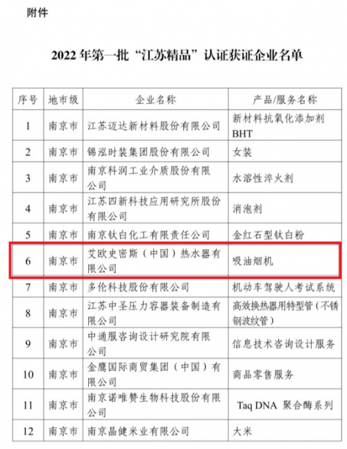 日前,江苏省市场监督管理局、江苏省发展和改革委员会等9大厅级机构联合授权的第一批“江苏精品”认证发布名单, A. O.史密斯「瀞」油烟机上榜“江苏精品”。