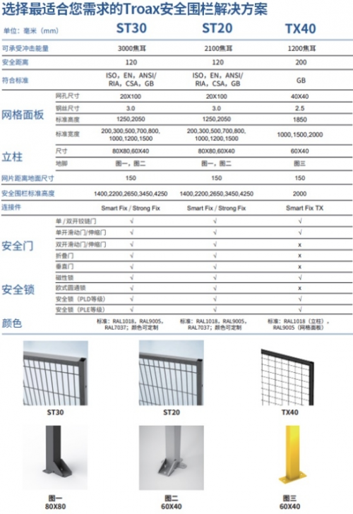 在安全方面,TX40钢制安全围栏系统可承受1200焦耳的冲击能量,适用于场地空间比较大的生产区域。对于可接受此抗冲击标准,并且有足够安全防护空间的客户来说,TX40将是一款高性价比的安全围栏系统,选择TX40可以节约成本,让客户达到经济效益最大化。在满足工厂需要的同时,保障安全、提高生产效率。如需了解更多产品细节,请阅读以下表格了解TX40产品以及其它也同样适合您的TROAX(图瓦斯)安全围栏解决方案。