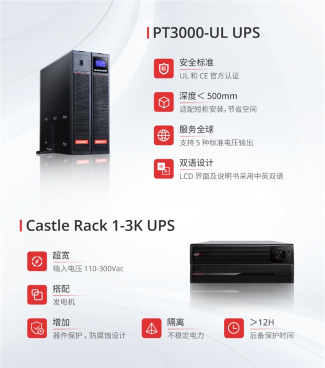 山特多年来紧跟储能系统发展和市场需求,面向源网侧、工商业及户用侧储能柜,风光发电等多个应用场景,最新推出了可适配短体储能柜、中英文双语显示、支持全球 5 种标准电压输出,并获得 UL 和 CE 认证的灵霄系列PT3000-UL 储能、光伏等新能源领域专用 UPS,与 Castle Rack 1-3K、Castle M Plus 一系列储能专用 UPS 产品,一起成功“出圈”,为新能源行业提供更专业的电源保护。