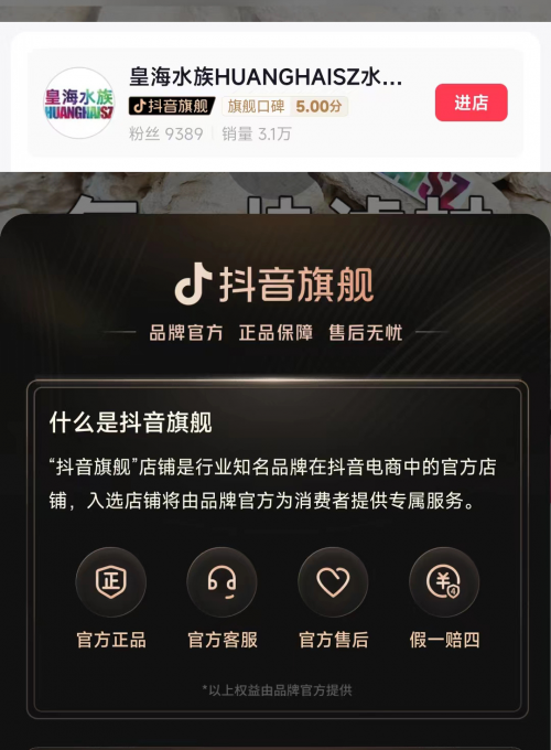 值得一提的是,皇海水族品牌在抖音平台上也崭露头角,成为第一家获得黑金旗舰品牌认证的海水品牌,也是第一家获得大数据认可的海水知名品牌。