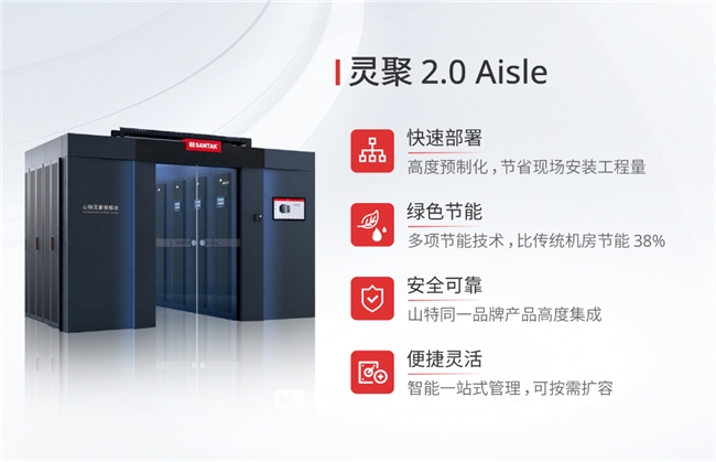 围绕客户场景的多元需求,山特为其量身定制了灵聚 2.0 Aisle 微模块,整合了高可靠的 ARRAY 3A3 PT 系列 UPS、灵聚专用列间空调等硬件产品,并利用智能动环监控系统对基础设备统一管理,大幅提升运维效率,实现无人值守。同时,采用的冷通道封闭实现了更好的制冷效果,减少能源使用。