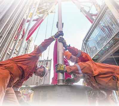 中国海油现场作业人员在海上钻井平台作业。吴艳辉摄