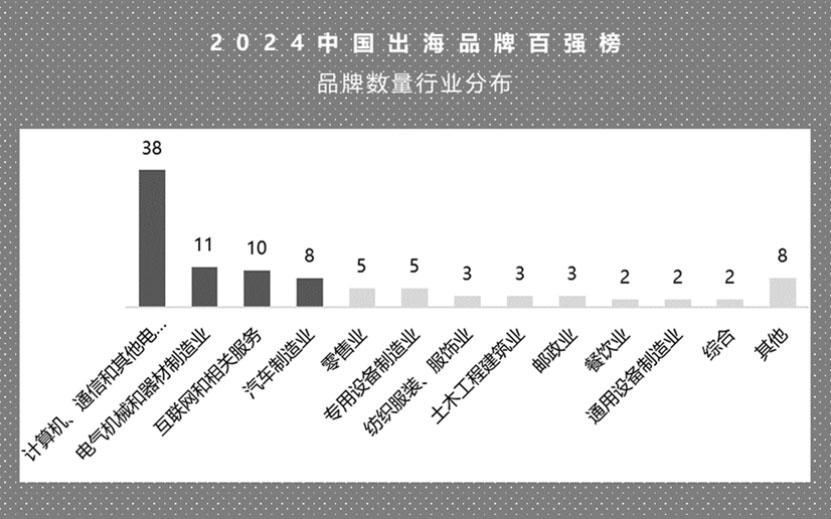 《2024中国出海品牌百强榜》覆盖的行业广泛,总共20个大类(依据国民经济行业分类GB/T 4754—2017)。从品牌数量分布来看,计算机、通信和其他电子设备制造业最多(38个),其次为电气机械和器材制造业(11个)、互联网和相关服务(10个)、汽车制造业(8个)、零售业(5个)和专用设备制造业(5个)。