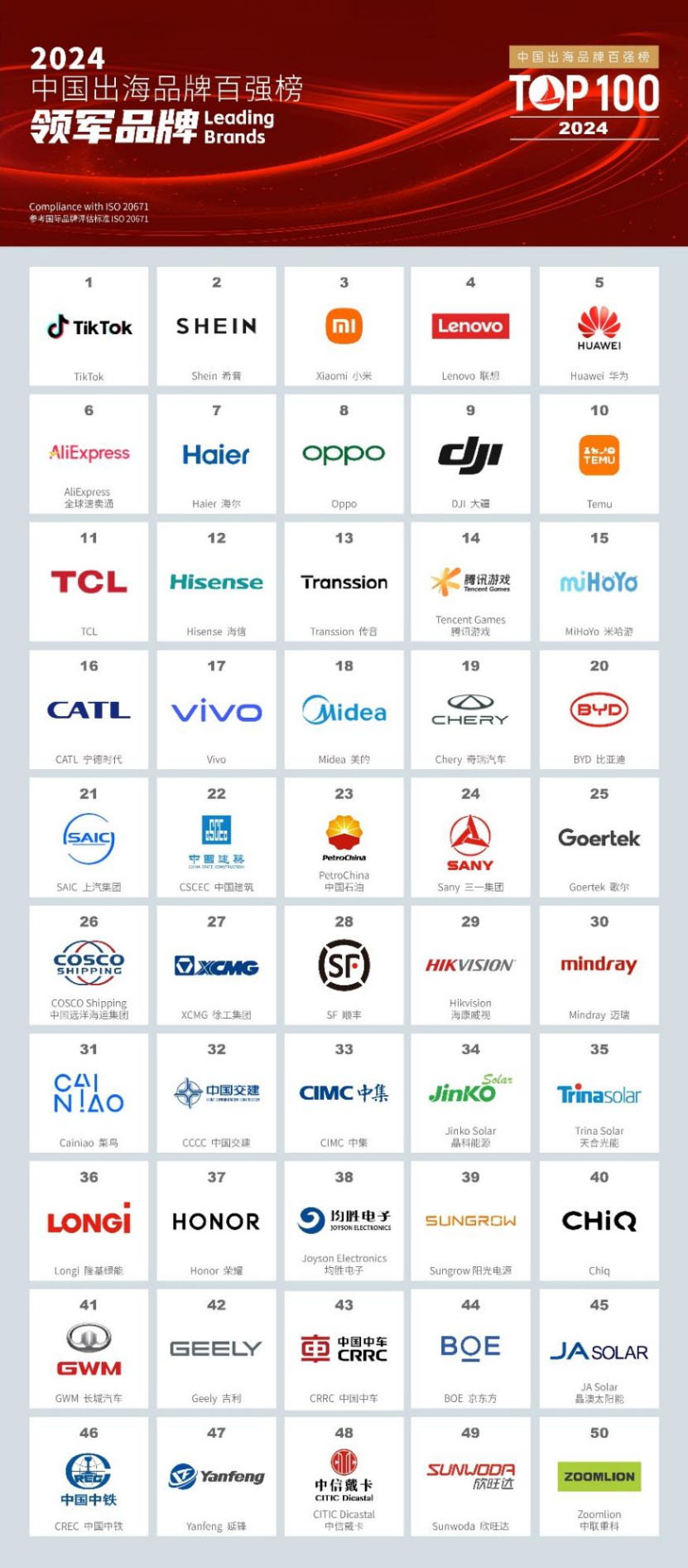 《中国出海品牌百强榜》是中国第一家由专业的国际品牌价值评估团队全程负责,参考国际标准化组织品牌评估标准ISO 20671的指标,使用经可信的第三方提供的数据进行公允评价的榜单。