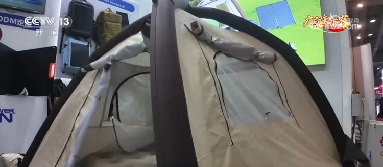 在广交会当中,除了家用电器的技术创新,还有很多藏在生活当中的小设计。比如这款太阳能充气帐篷,它不需要支架,拿起一个包说走就能走了。它通过用电给帐篷充气,两分钟的时间就能够搭起一个帐篷。除此以外,您也会发现上面有8块太阳能光伏板,这几块光伏板比传统的光伏板轻了近70%的重量,接收到的光能够通过模块化电池满足户外的用电需求。比如,在户外,手机没电了怎么办?这个时候,接上电线,手机就能够充上电了。