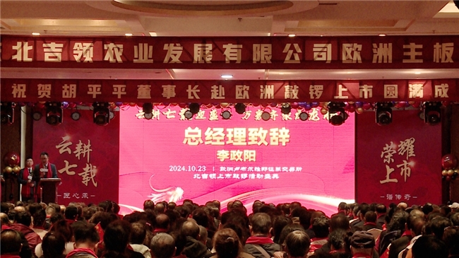在辽阳现场,李政阳说云耕七载迎盛世,万家齐聚庆龙腾。“上市敲锣”是北吉领品牌发展历程中具有里程碑意义;他强调,胡平董事长创立北吉领以来,责任与使命一肩挑,与同事们全力以赴为黑果花楸产业璀璨未来拼搏奋斗。今天在欧盟主板荣耀上市,实现花楸人一直以来的伟大夙愿,开启北吉领发展的壮丽新篇章!