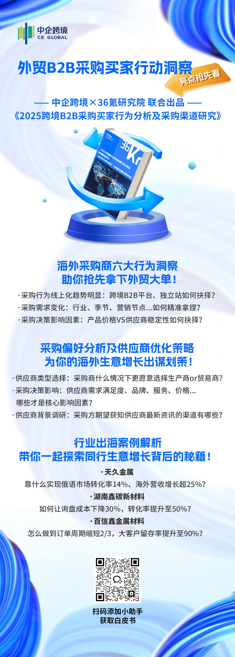 为帮助外贸企业拓展非美市场,中企跨境还升级了优惠政策,其中包括网站多语言版本、海外社媒营销、海关数据等在内的多维度扶持,以此助力中国企业更好抵御关税风暴带来的不确定性风险。广交会期间,还邀请36氪研究院院长邹萍、爱洁棉签CEO王欢等业内专家把脉跨境B2B采购趋势,帮助更多外贸企业有效获客、成功出海。