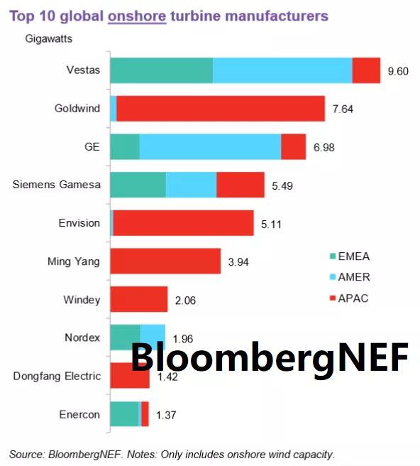 除此之外,明阳智慧能源,运达风电,Nordex,东方电气,Enercon分别位列全球第六至第十。