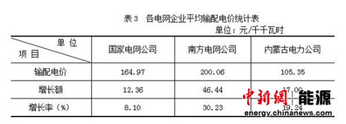 从企业看,国家电网公司平均输配电价为164.97元/千千瓦时,南方电网公司为200.06元/千千瓦时,内蒙古电力公司为105.35元/千千瓦时(见表3)。