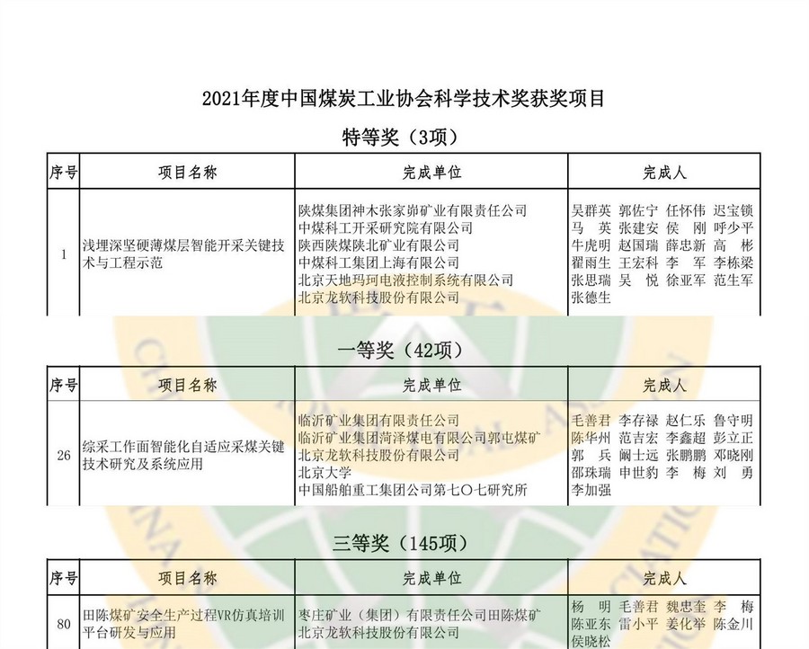 近日,由中国煤炭工业协会、中国煤炭学会组织开展了2021年度“中国煤炭工业协会科学技术奖”评审活动,龙软科技参与完成的3项科技成果分别喜获特等奖、一等奖及三等奖。