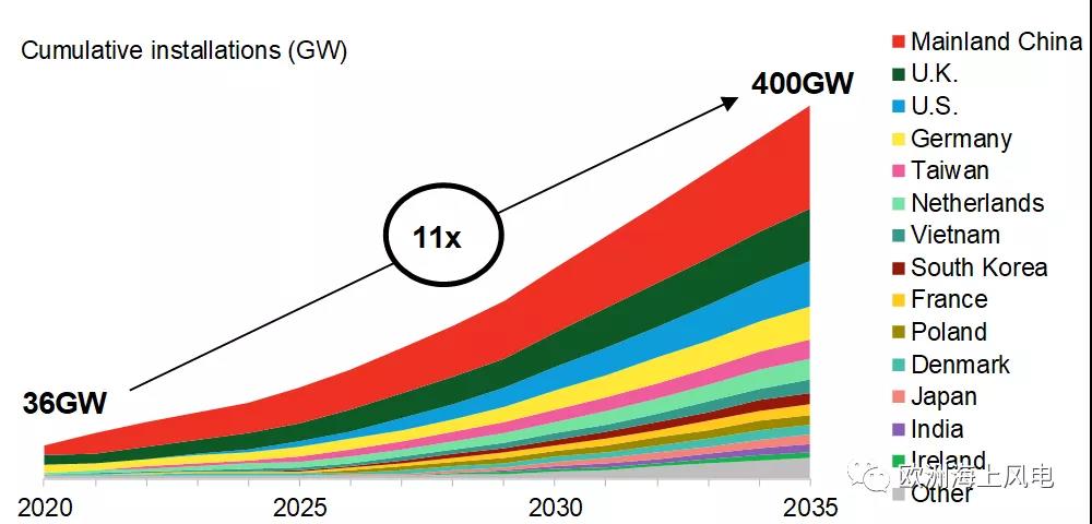 据彭博新能源预测,到2035年,全球海上风电累计装机将到到400GW,和2020年36GW的装机相比增长11倍。中国大陆、英国、美国、德国、荷兰将位居前五。(注:本文数据为BNEF统计,中国大陆有关数据可能与国家能源局后期发布数据有出入,但其它国家和地区装机准确度较高,具有更高参考价值。)