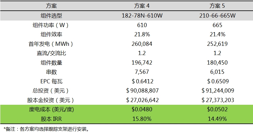 西班牙Lorca,Murcia项目测试中,182-78N-610W组件对比210-66-665W组件,LCOE降幅更大,每发1度电折合成本为$0.0480;类比和青海地区相同的出色组件性能,西班牙Lorca,Murcia项目地占据更好光照条件的天然地理优势,使得其股本IRR更高,达到15.80%。