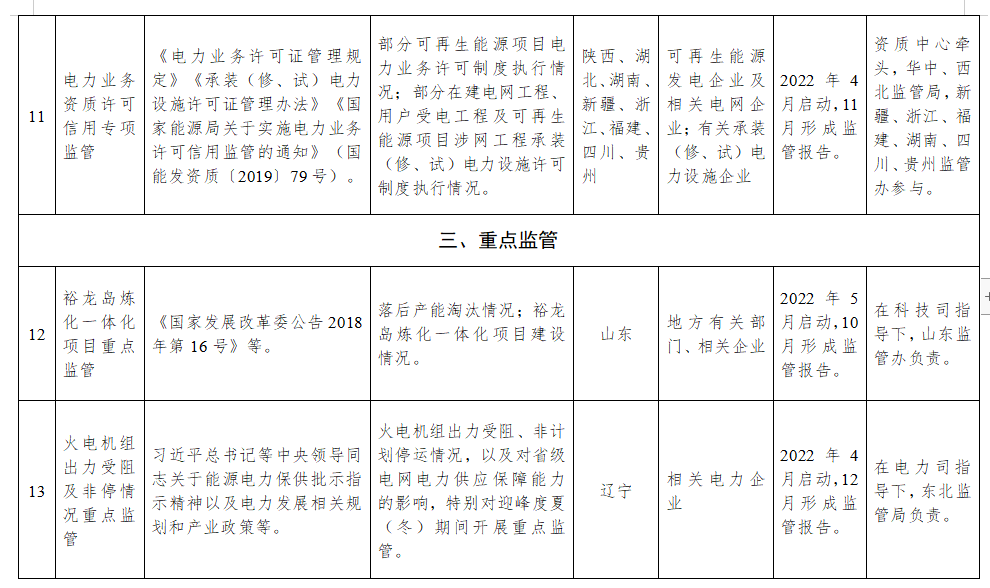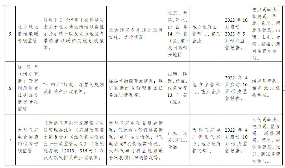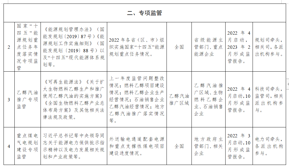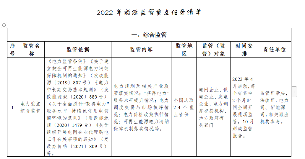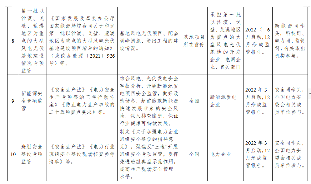 近日,国家能源局官网发布关于印发《2022年能源监管重点任务清单》的通知,主要包含国家“十四五”能源规划重点任务年度落实情况专项监管、第一批以沙漠、戈壁、荒漠地区为重点的大型风电光伏基地建设情况专项监管、