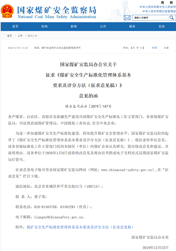 国家煤矿安监局网站12月25日发布关于征求《煤矿安全生产标准化管理体系基本要求及评分方法(征求意见稿)》意见的函。