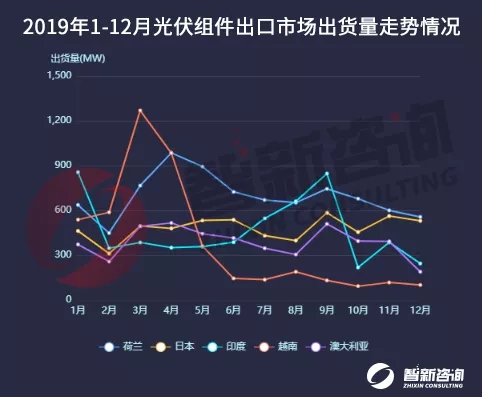 从出口区域市场来看,荷兰出货量8.35GW,出口额21.17亿美元,排名第一,日本出货量5.77GW,出口额16.01亿美元,位居第二,印度出货量5.58GW,出口额12.41亿美元,排名第三。