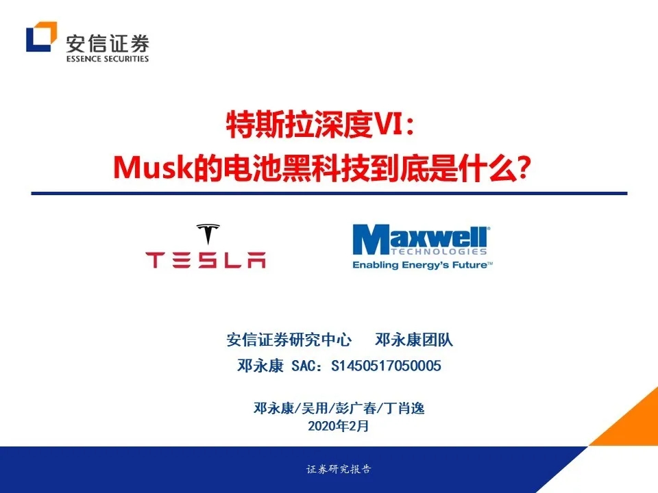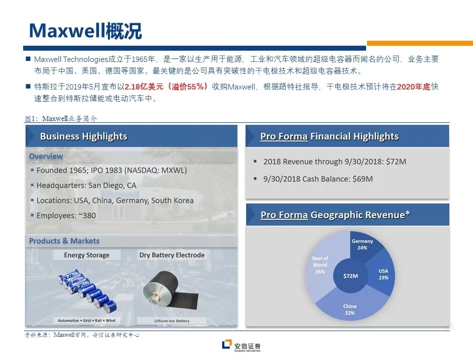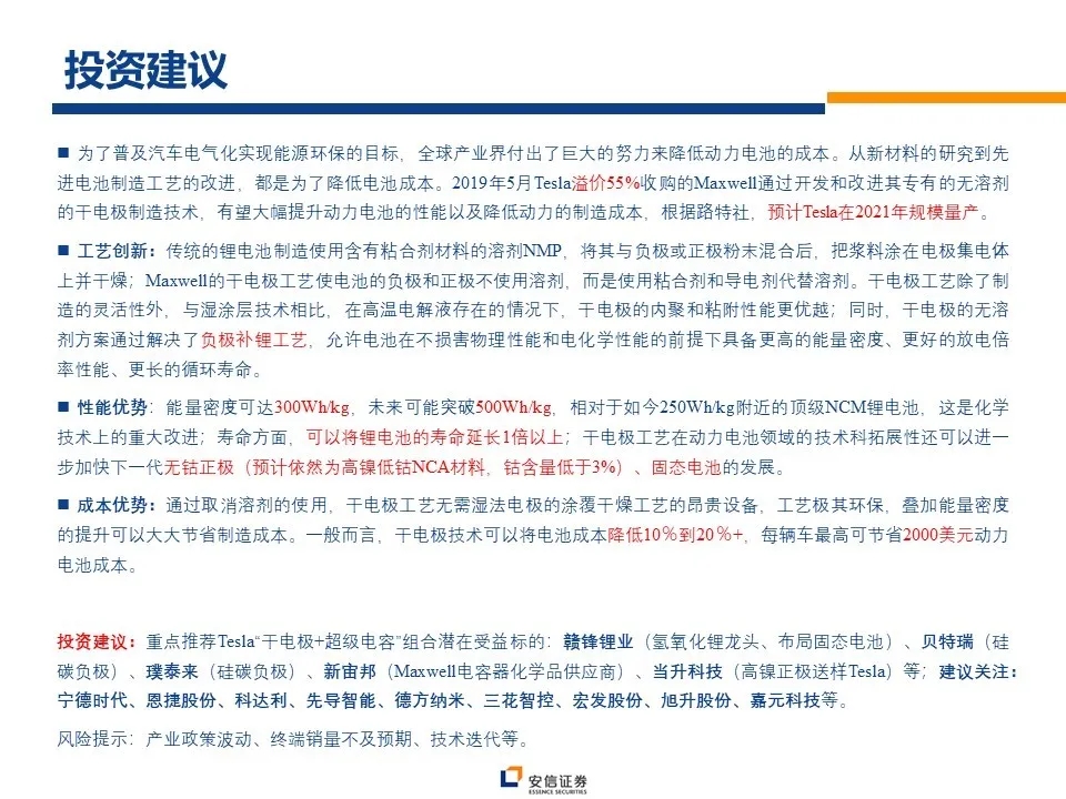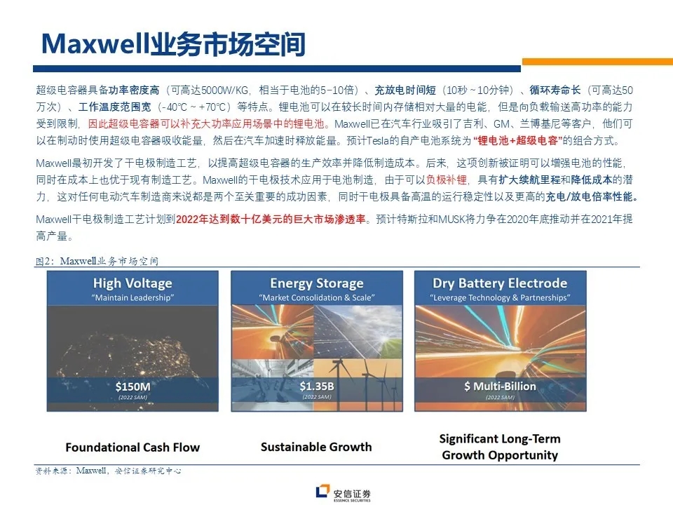 特斯拉2.18亿元溢价收购超级电容企业Maxwell,路透社报道其干电极技术预计将在2020年底应用于特斯拉储能或电动汽车中。