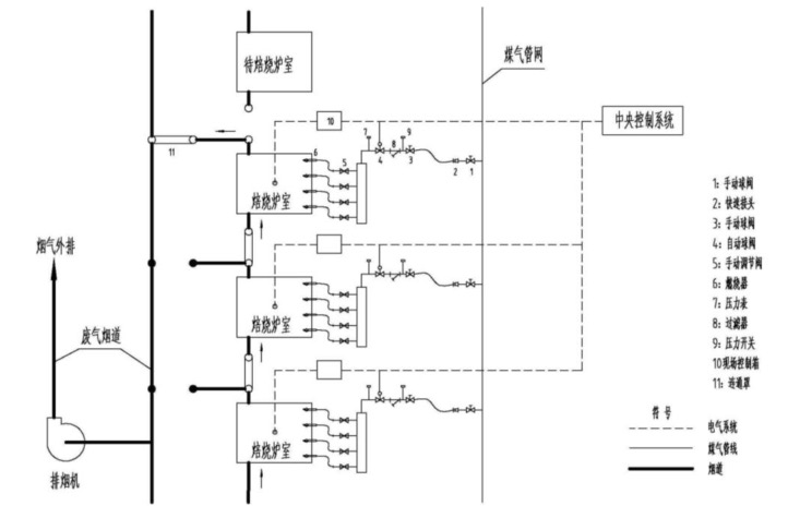 (1)采用先进的煤气燃烧器、可移动式燃烧架和烟气联通罩,通过采集炉室温度和系统压力参数,自动调节煤气用量和烟气量,实现对炉室温度的精确控制,提高煤气及沥青烟的燃烧效率,提高产品成品率。