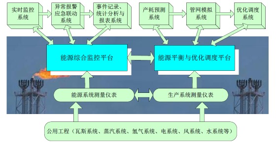 在企业具备能源计量检测仪表和DCS自动化系统的支撑下,通过大型实时数据库,采集各种生产和能源数据,建设能源综合监控系统平台,并采用能源产耗预测、能源管网模拟、能源多周期动态优化调度等核心技术,建立能源产耗预测模型、能源管网模拟模型和能源系统优化调度模型,在能源平衡与优化调度平台上自动给出各种能源介质的优化调度和分配方案,实现工业企业主要能源系统(燃料气、氢气、蒸汽、电力、水系统等)的优化调度和运行,提高企业能源综合利用效率和能源管理水平。