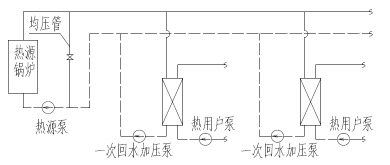 锅炉房内的热源循环泵,负责热源内部的水循环;热力站一次网侧设置加压泵,负责一次网的水循环;热站二次网侧设置循环水泵,负担用户侧的水循环,如图1。