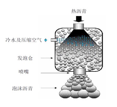 泡沫沥青:是采用将热沥青和水在专用的发泡装置内混合、膨胀,形成的含有大量均匀分散气泡的沥青材料(见图(1)。由于含有大量气泡,因此泡沫沥青粘度较小,可以在较低的温度下与石料拌和。