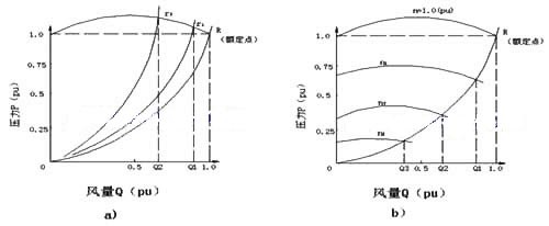 图2.2(a)为采用第一种方法时的特性 ,管路的节流阻力改变时,可以得到所需的送风特性。图2.2(b)为调速情况下风机的运行特性图中(pu)均采用标么值。