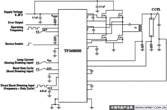 同步恒定工作频率;可编程相位延迟用于控制从操作的运行频率;光—电压稳压以及光—电流稳流;模拟调光及脉冲调光;多控制器件下的可调节分置式脉冲调光;启动或出错状态下可程序化的校正电压时长;开灯保护和短路保护;内置高温保护与低电压锁定模式。TPS68000高效移相全桥CCFL控制器应用电路见图4。